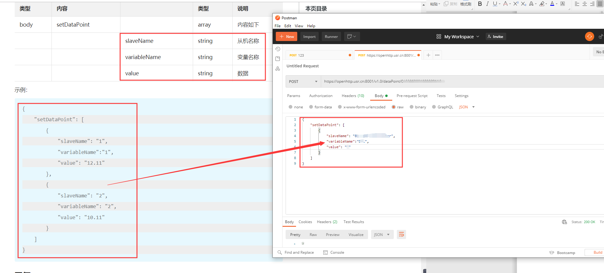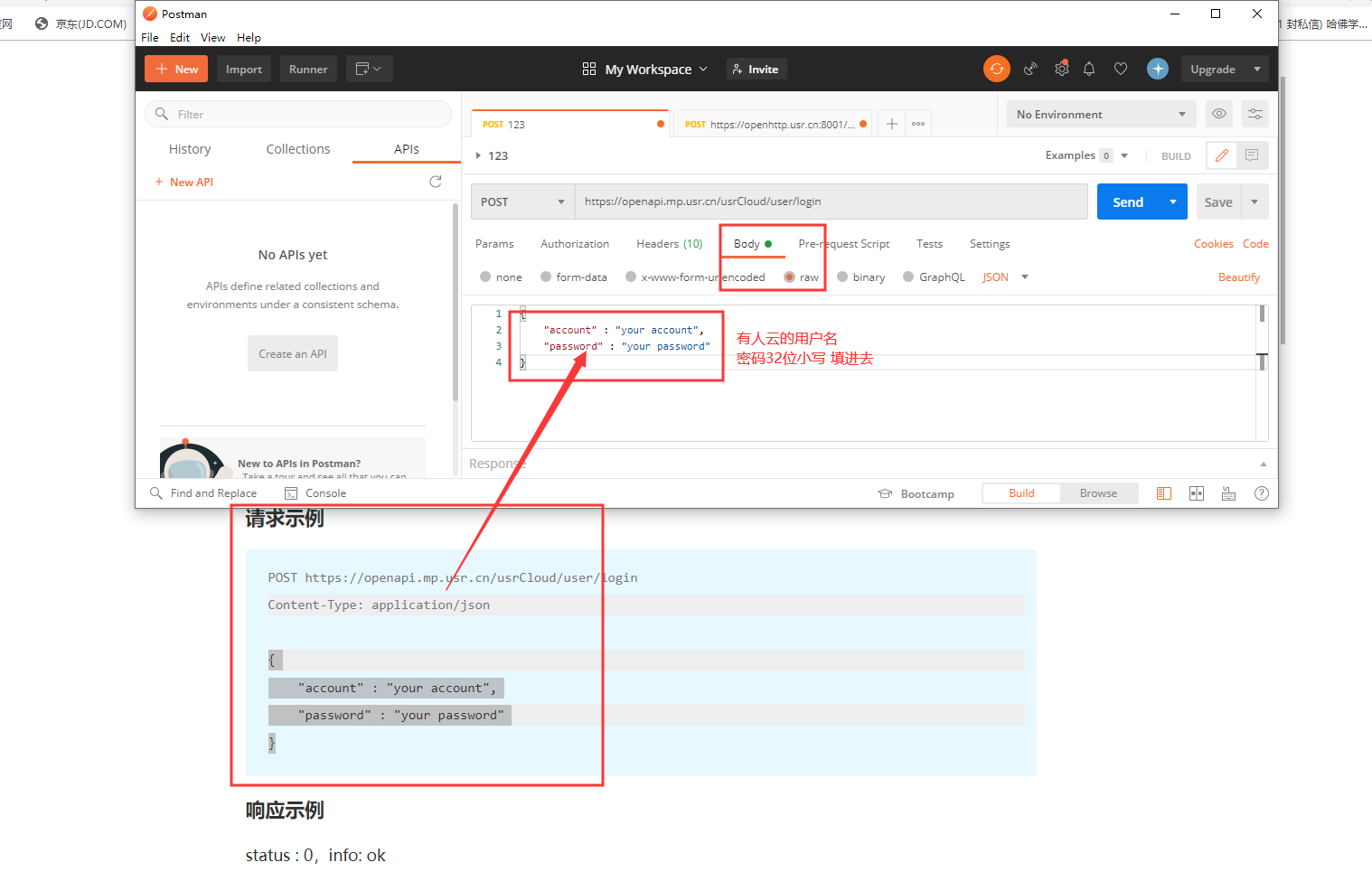 3、將請(qǐng)求示例大括號(hào)中得數(shù)據(jù)復(fù)制到body的raw中