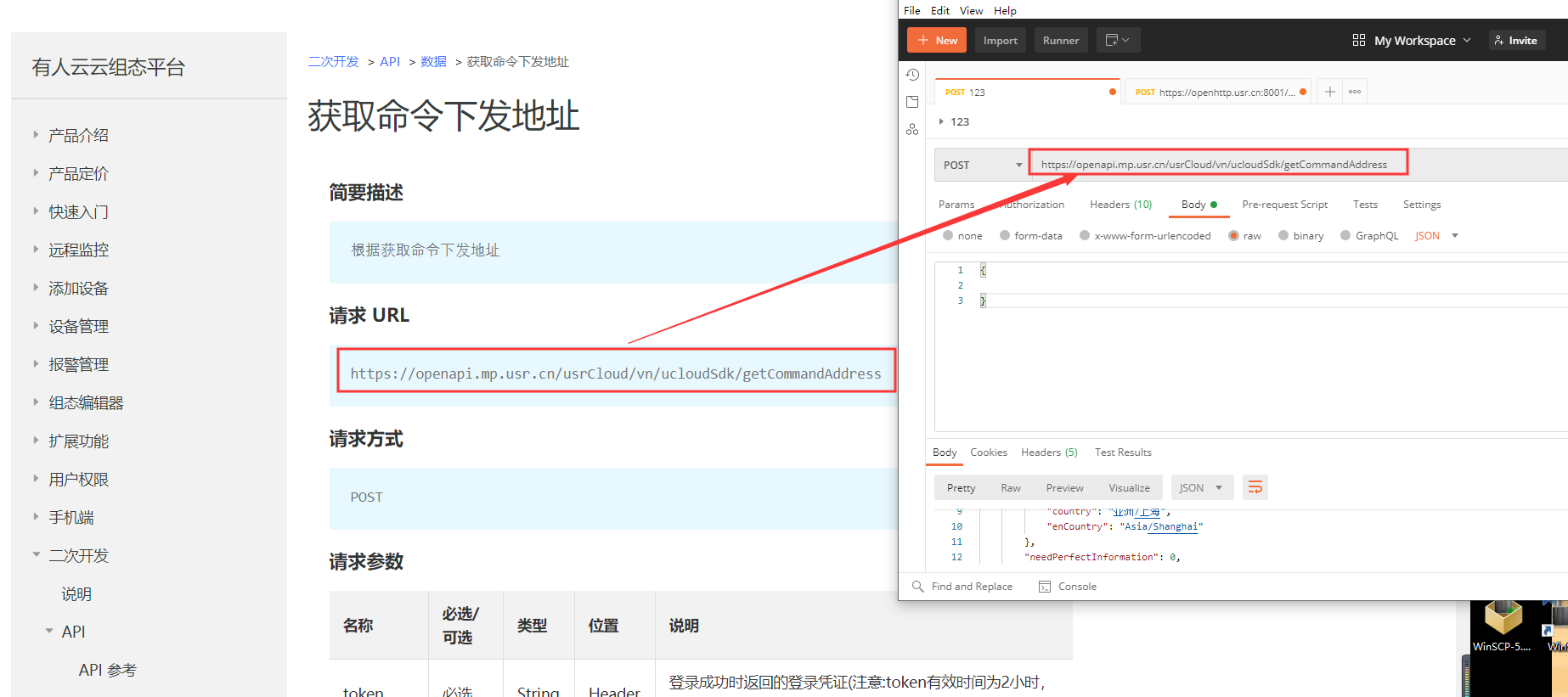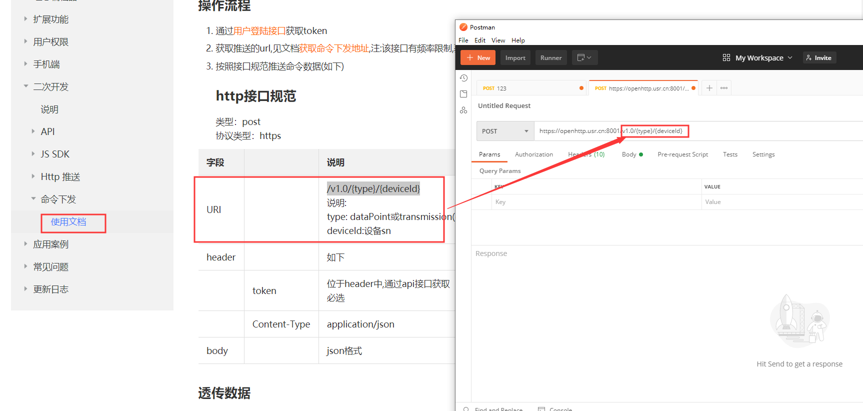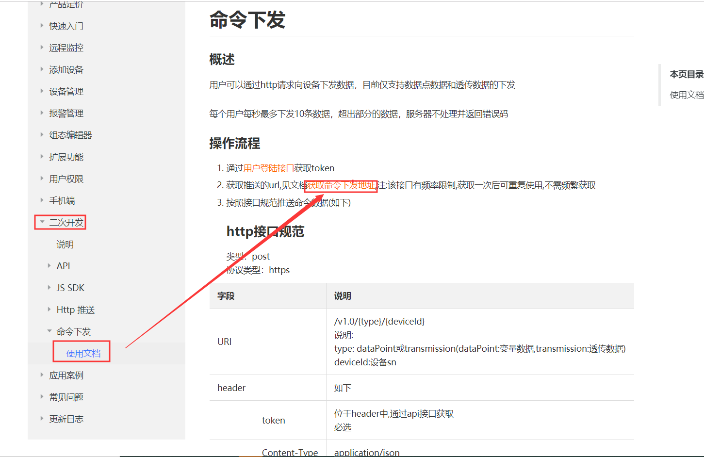 4、在二次開(kāi)發(fā)文檔界面打開(kāi)獲取命令下發(fā)地址(二次開(kāi)發(fā)-命令下發(fā)-使用文檔-獲取命令下發(fā)地址)