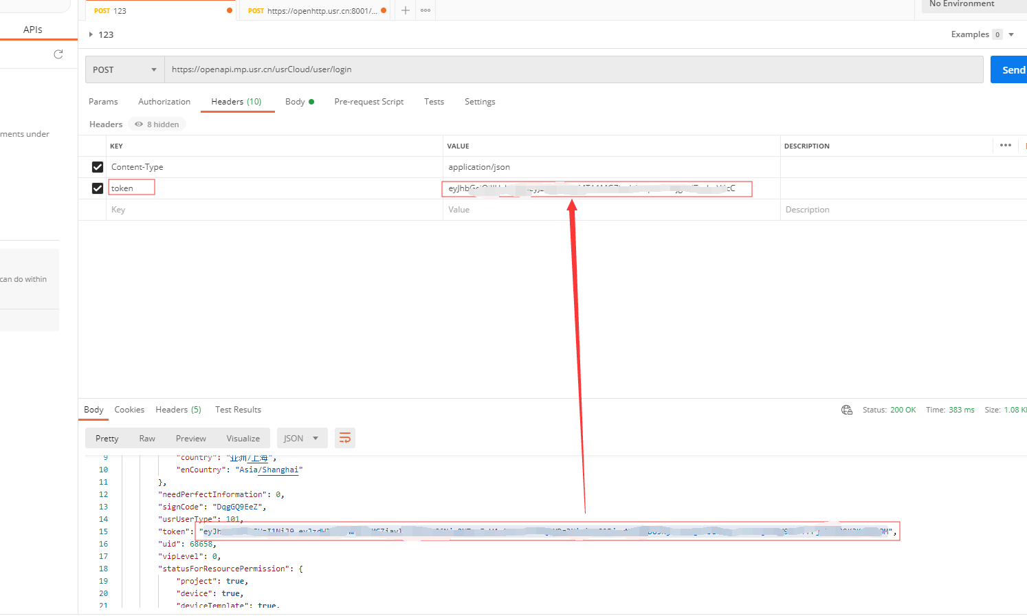 在headers中添加Content-Type和token,值分別為application/json以及剛剛獲取到的token