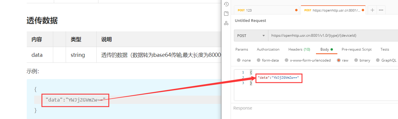 數(shù)據(jù)透?jìng)鞯脑?huà)填入"data":"YWJjZGVmZw==",其中data中的數(shù)據(jù)為透?jìng)鞯臄?shù)據(jù)(數(shù)據(jù)轉(zhuǎn)為base64傳輸,最大長(zhǎng)度為8000個(gè)字符)