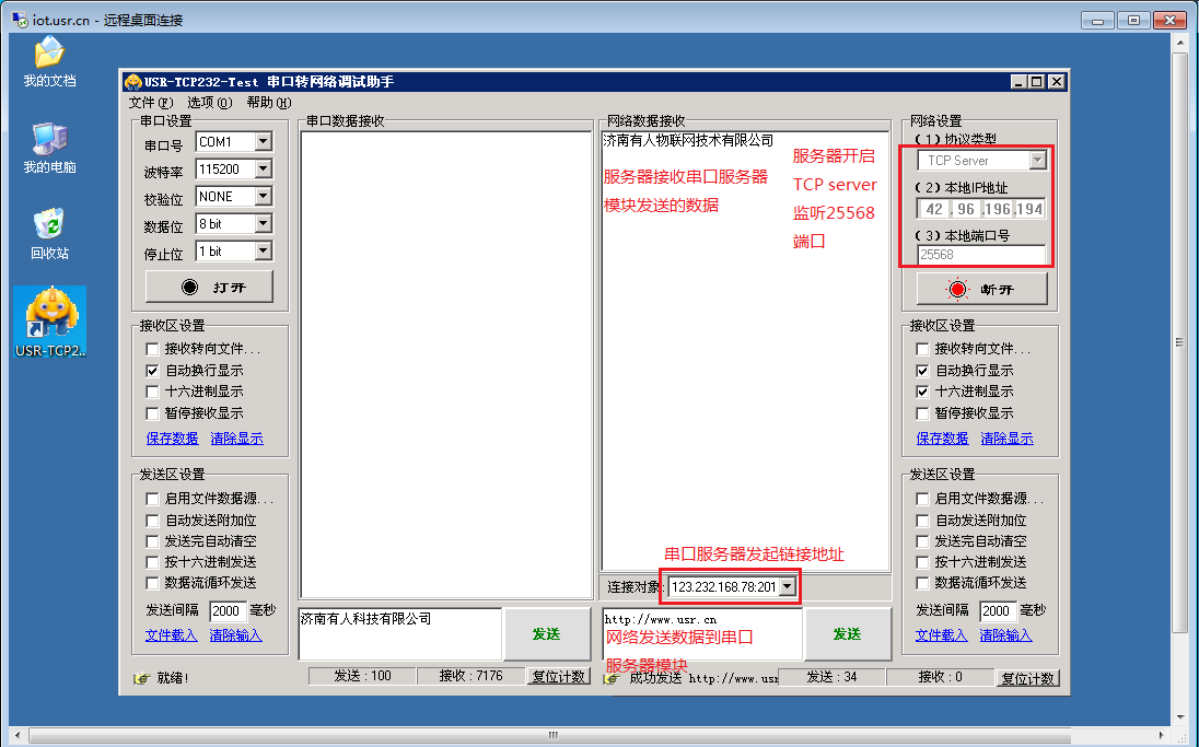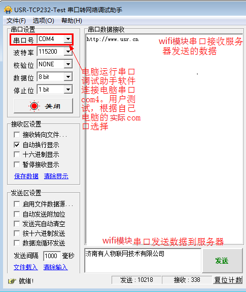 以上是服務器發(fā)送數(shù)據(jù)和接收數(shù)據(jù):以下使用電腦串口連接WiFi串口串口,電腦運行串口調試軟件,進行發(fā)送和接收服務器的數(shù)據(jù)。