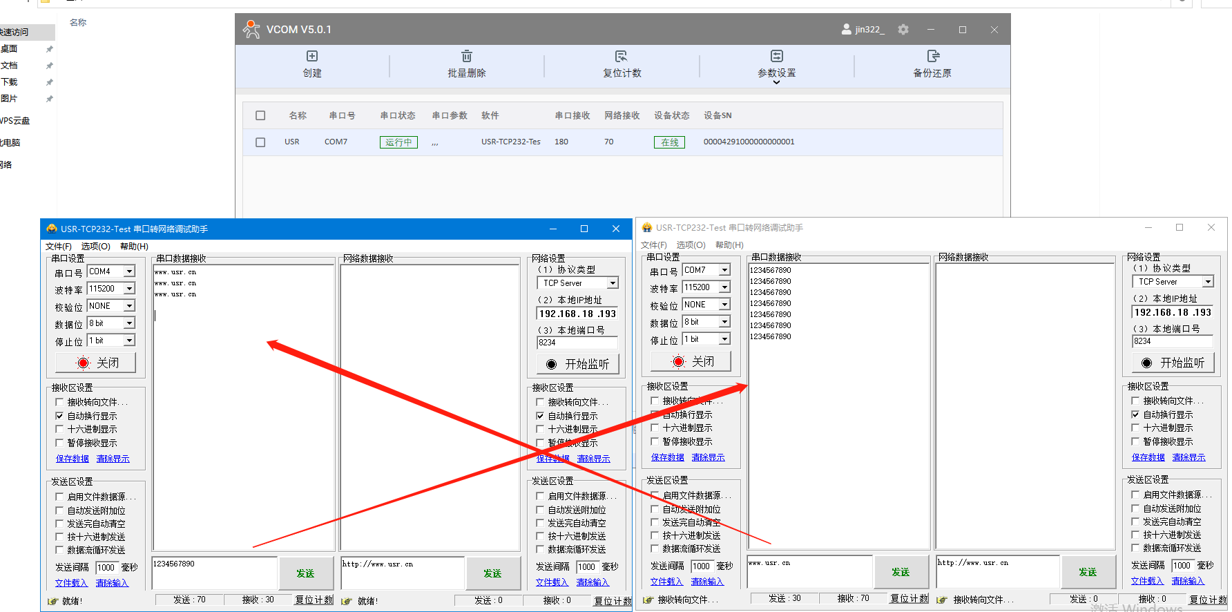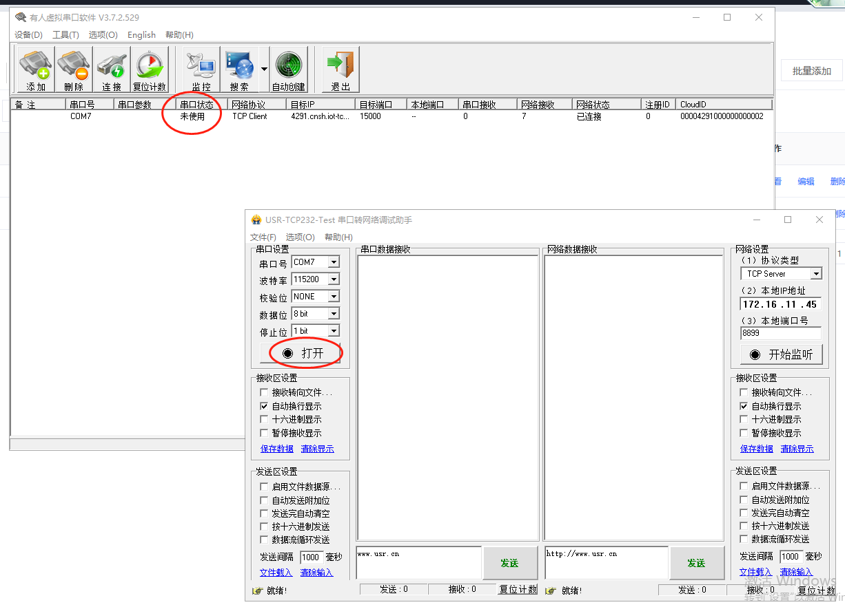 前部分示例是產(chǎn)品和虛擬串口(V3.7.2.529版本)一對(duì)一通訊示例,