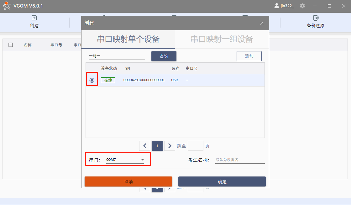 選擇串口映射單個(gè)設(shè)備,勾選在線的有人產(chǎn)品USR,用空閑的COM7作為虛擬串口的COM口號(hào),點(diǎn)擊確定。