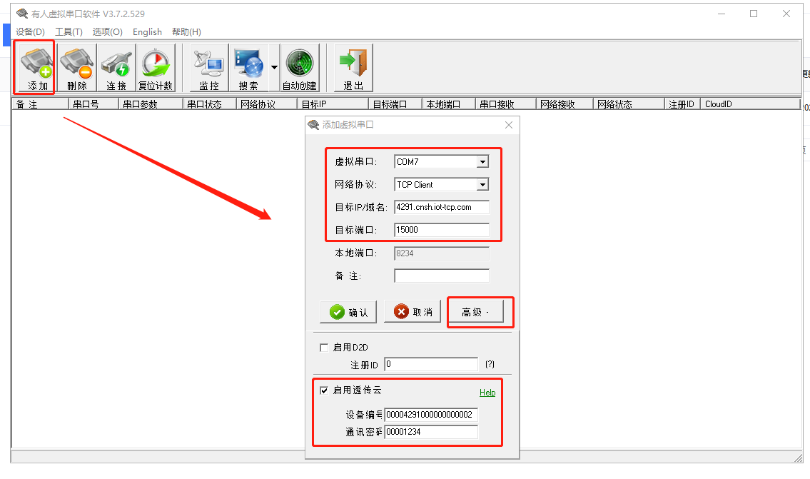 高級(jí)設(shè)置開(kāi)啟透?jìng)髟?,輸入有人云添加設(shè)備的編號(hào)ID00004291000000000002和密碼00001234,點(diǎn)擊確認(rèn)。