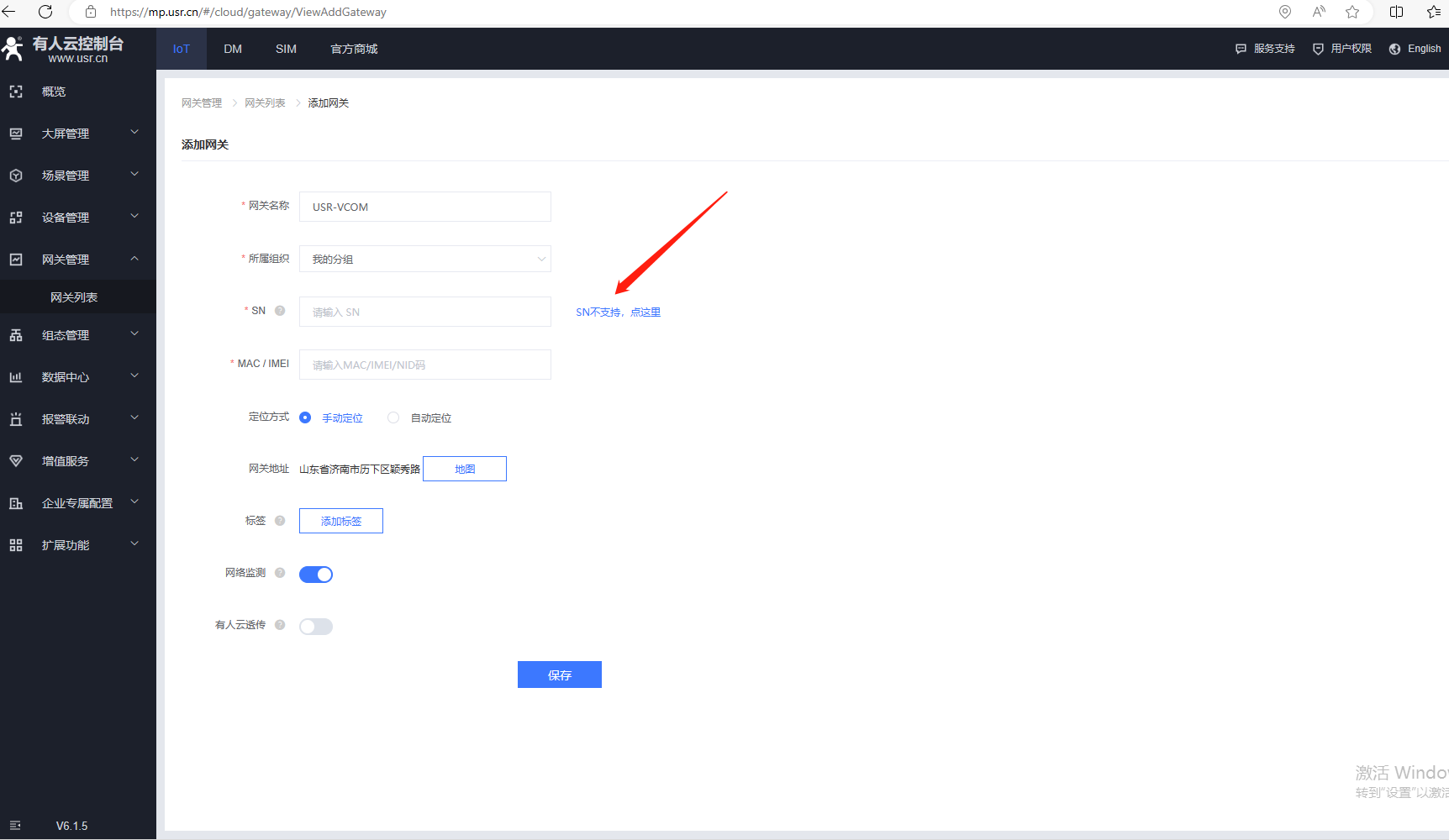 2、USR-VCOM虛擬串口添加,點(diǎn)擊SN不支持,點(diǎn)這里,用自動(dòng)生成的ID方式上云,在有人云上添加設(shè)備,勾選有人云透?jìng)鳌?/p>