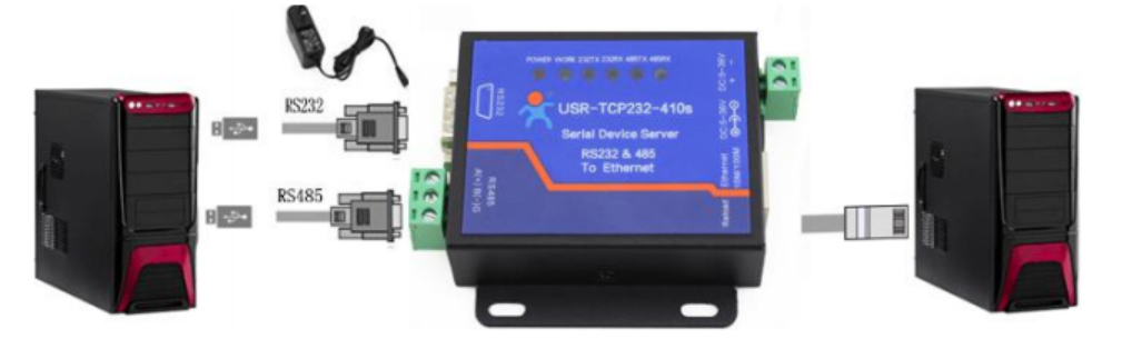 1. 將 410S(USR-TCP232-410S,簡稱 410S 下同)的串口通過串口線(或USB 轉(zhuǎn)串口線)與計算機相連接,通過網(wǎng)線將 410S 的網(wǎng)口 PC 的網(wǎng)口相連接,檢測硬件連接無錯誤后,接入我們配送的電源適配器,給 410S 供電。觀察指示燈狀態(tài)確定410S是否正常工作:POWER燈常亮,WORK燈閃爍。