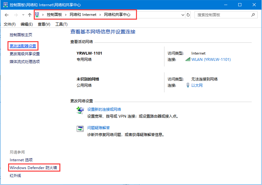 2. 按路徑:控制面板》網(wǎng)絡和Internet》網(wǎng)絡和共享中心找到“windows防火墻”和“更改適配器設置”選項,關閉防火墻并禁用與本次測試無關的網(wǎng)卡,并關閉電腦殺毒軟件。
