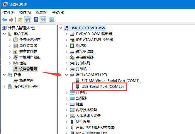 5. 在設備管理器中查看端口信息,確定410S串口使用的串口號,如下圖所示電腦端口號為COM29.
