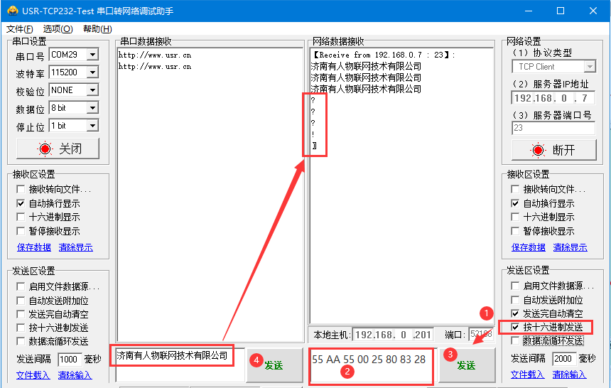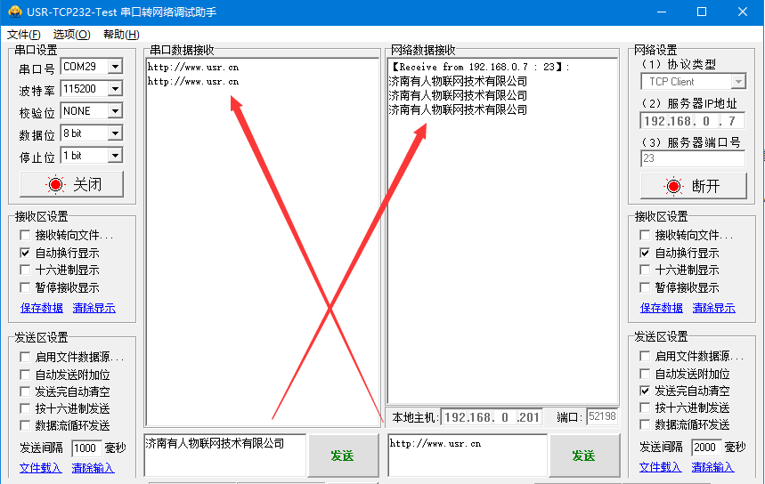 將軟件串口設置中的串口號配置為COM29。由于設備默認協(xié)議類型為TCP server,所以電腦端連接設備需要設置為TCP client連接設備的server。服務器IP設置為設備IP:192.168.0.7,服務器端口配置為23。