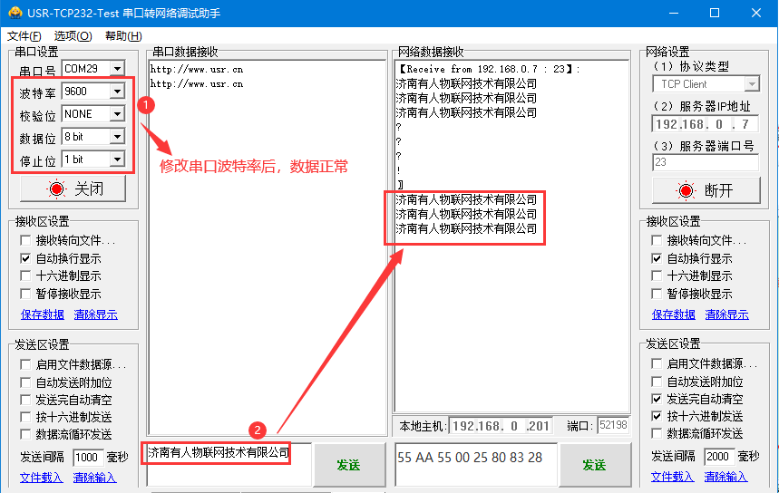 410s現(xiàn)串口參數(shù)為115200、NONE、8、1, 將模塊串口參數(shù)修改為9600、NONE、8、1通信, 需要在網(wǎng)絡端按十六進制下發(fā)55 AA 55 00 25 80 83 28, 發(fā)送完成后,軟件打開串口需要修改為9600、none、8、1, 不然數(shù)據(jù)會顯示為亂碼。 注意:本命令所作的修改立即生效,不需要重啟,當次有效,不會保存,斷電丟失。