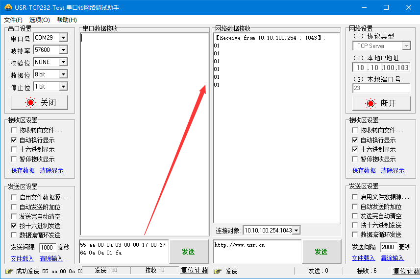 7、依據協(xié)議確定要往服務器發(fā)送有效數據:01。