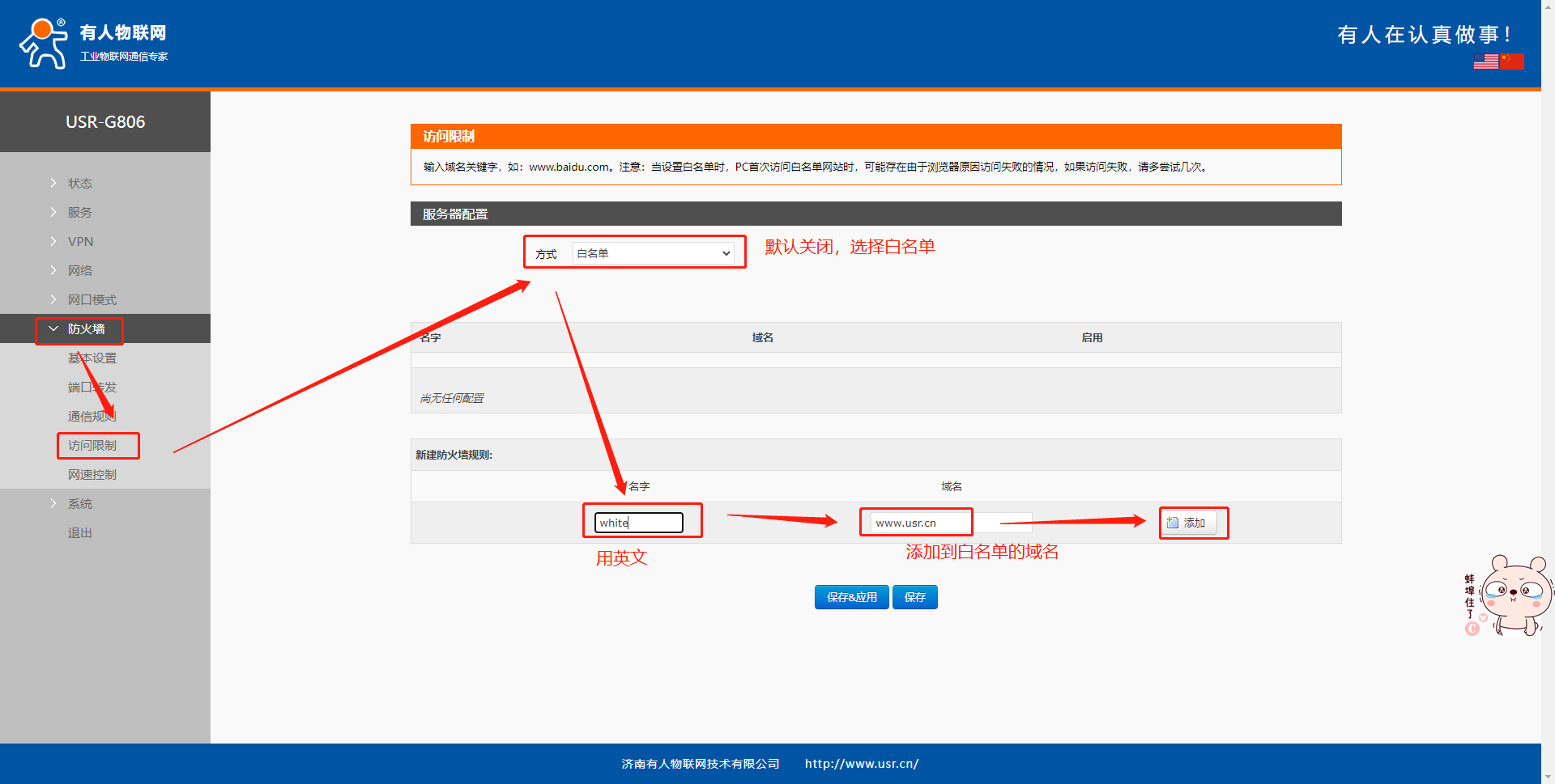 連接工業(yè)路由器的設(shè)備除白名單設(shè)置的域名地址可以訪問外,其它域名地址都不能夠正常訪問,白名單都可以設(shè)置多條。