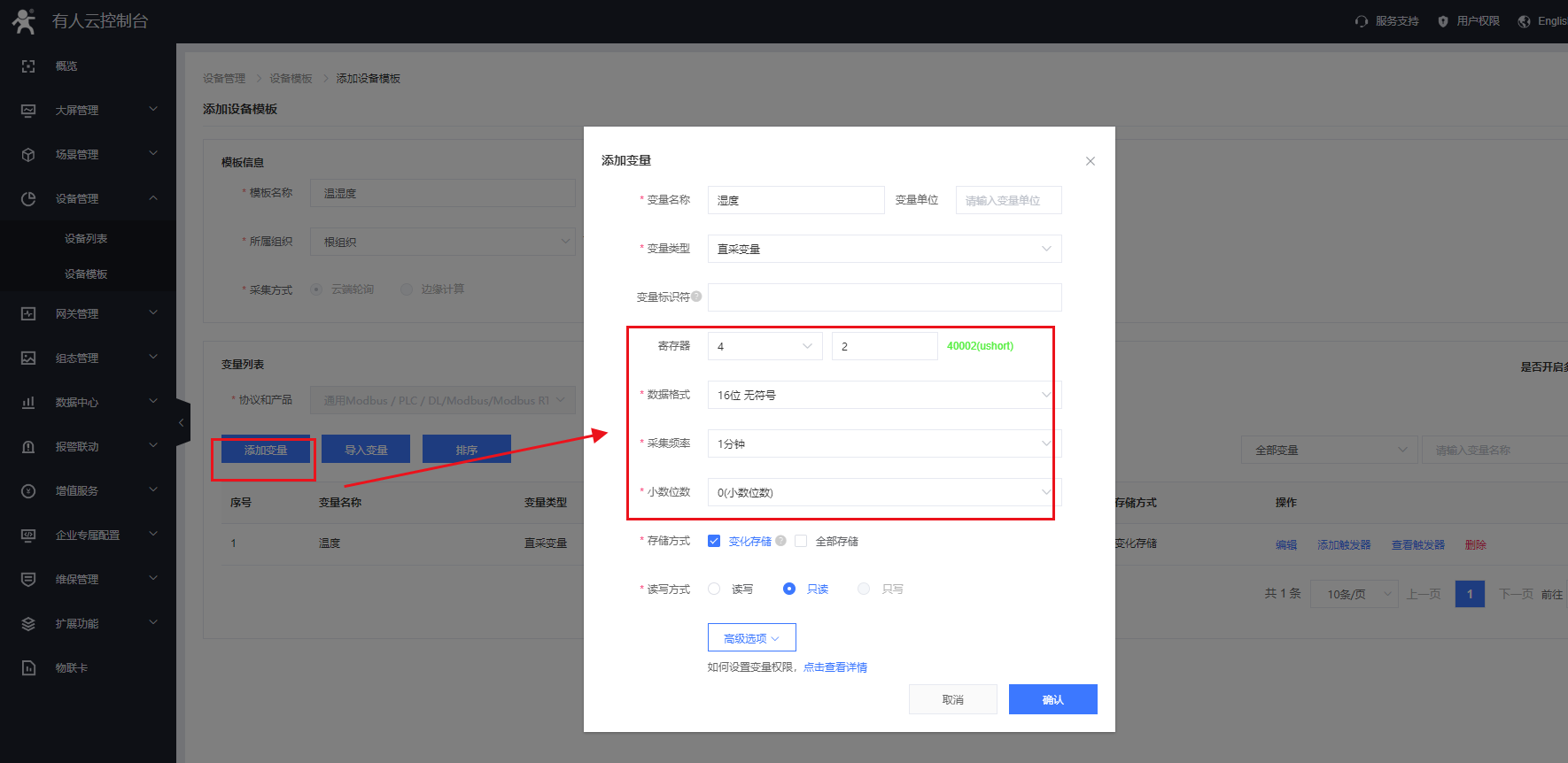 2)在設(shè)備管理---設(shè)備模板界面添加需要采集的從機(jī)變量點(diǎn)。寄存器信息需要與串口設(shè)備進(jìn)行匹配。(測(cè)試用modbus savle 軟件模擬modbus rtu485設(shè)備,采集變量40001、40002)