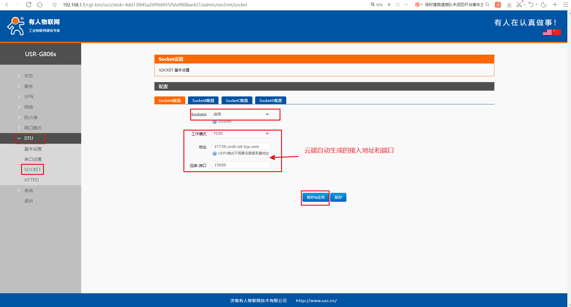開啟SOCKET功能,設(shè)置有人云的IP地址(云端自動(dòng)生成的接入地址)以及端口號(hào)(15000),然后點(diǎn)擊應(yīng)用