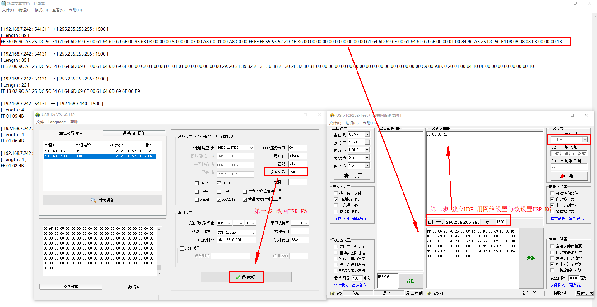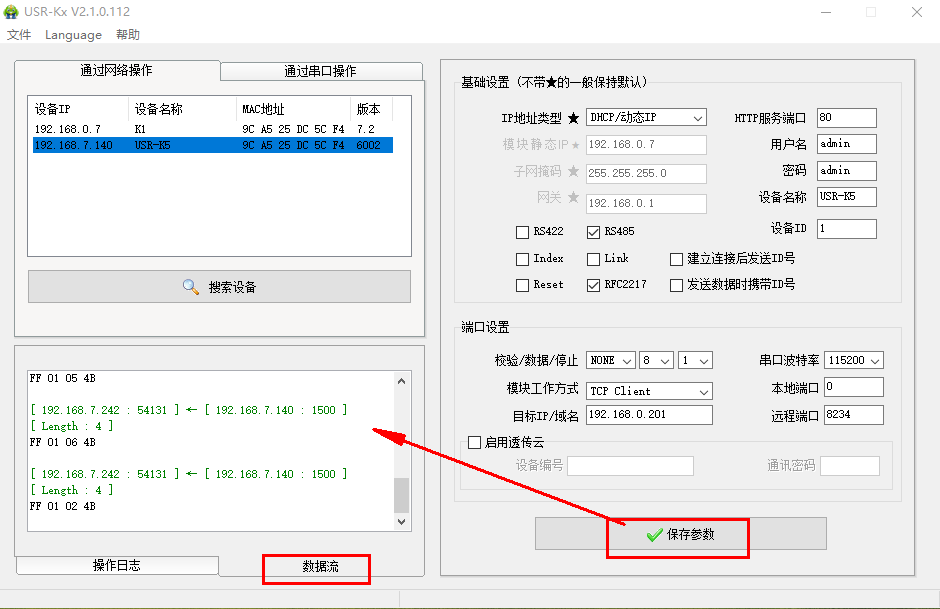 二、USR-K5使用USR-Kx軟件,點(diǎn)擊保存參數(shù),數(shù)據(jù)流可以查看對(duì)應(yīng)的網(wǎng)絡(luò)協(xié)議。
