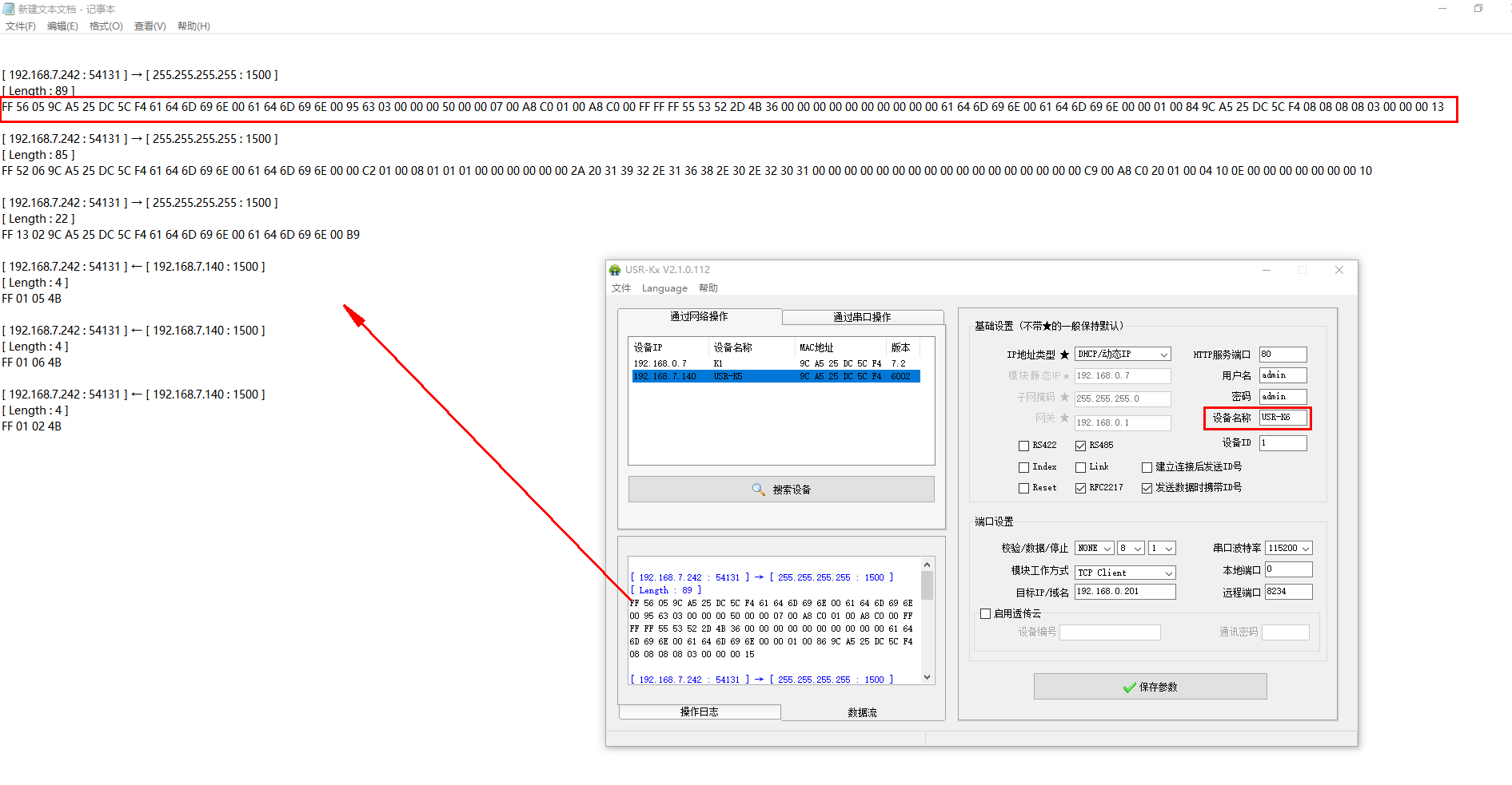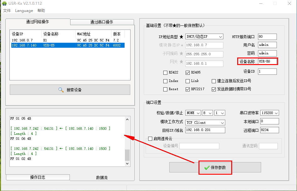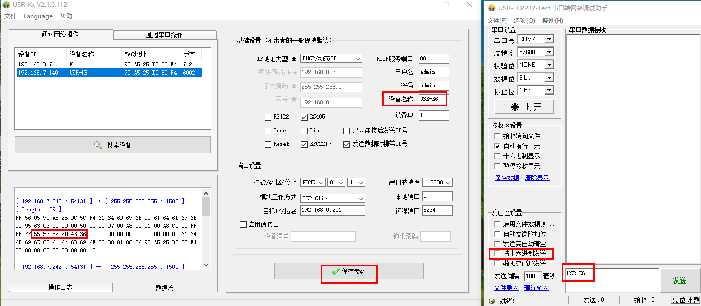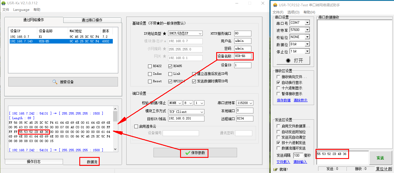 三、清空數(shù)據(jù)流,USR-K5設(shè)備名稱(chēng)改為USR-K6,點(diǎn)擊保存參數(shù),數(shù)據(jù)流可以查看對(duì)應(yīng)的網(wǎng)絡(luò)協(xié)議。