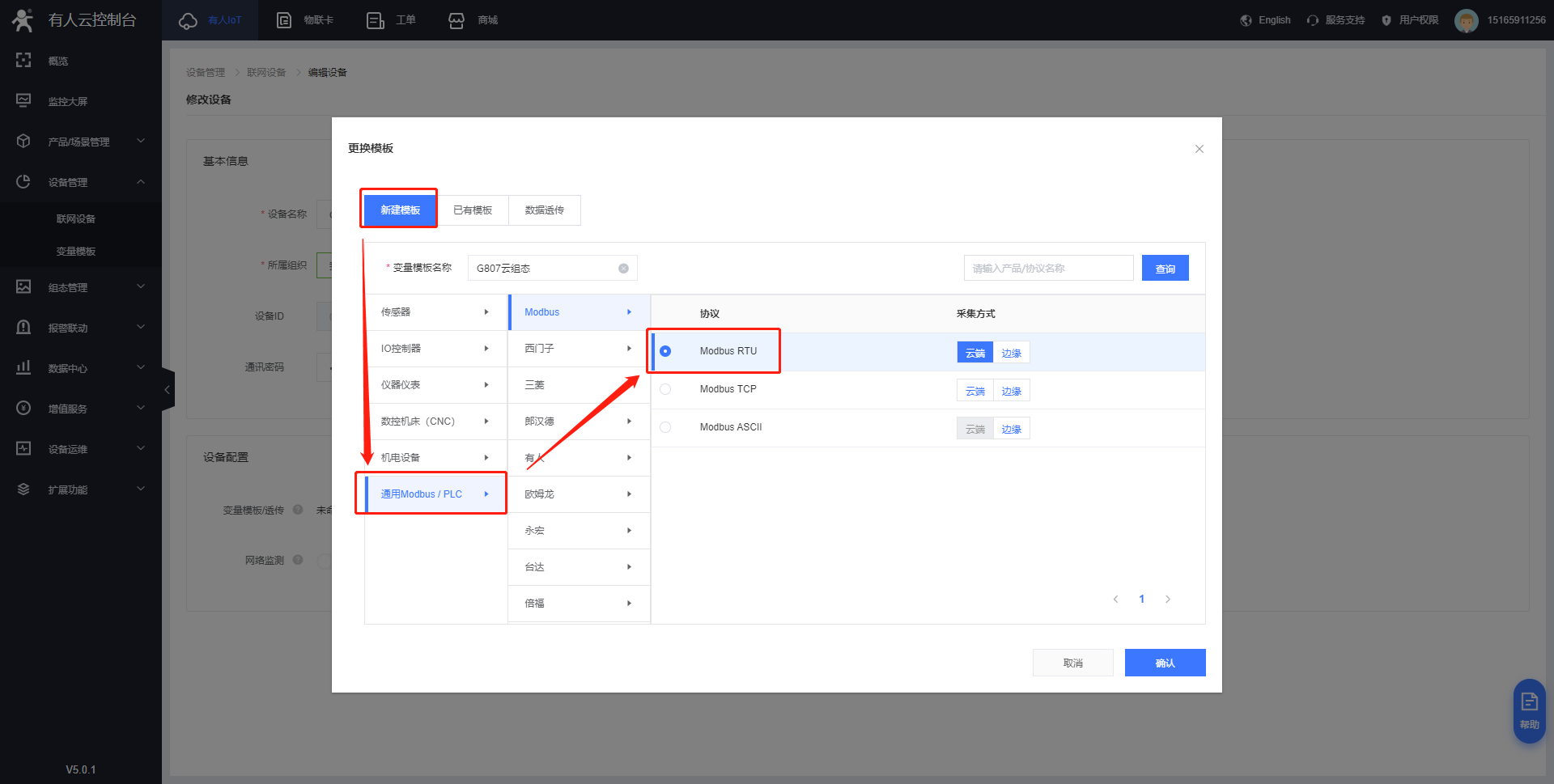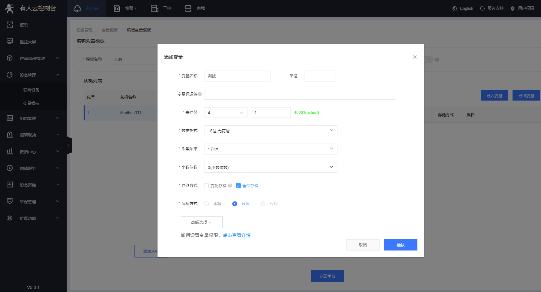 添加模板—自定義設(shè)備模板名稱—Modbus—Modbus Rtu—云端采集—保存