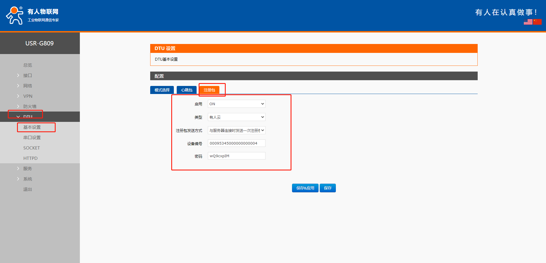 4>設(shè)置G809的注冊包信息,設(shè)備編號和密碼可以在云平臺查詢