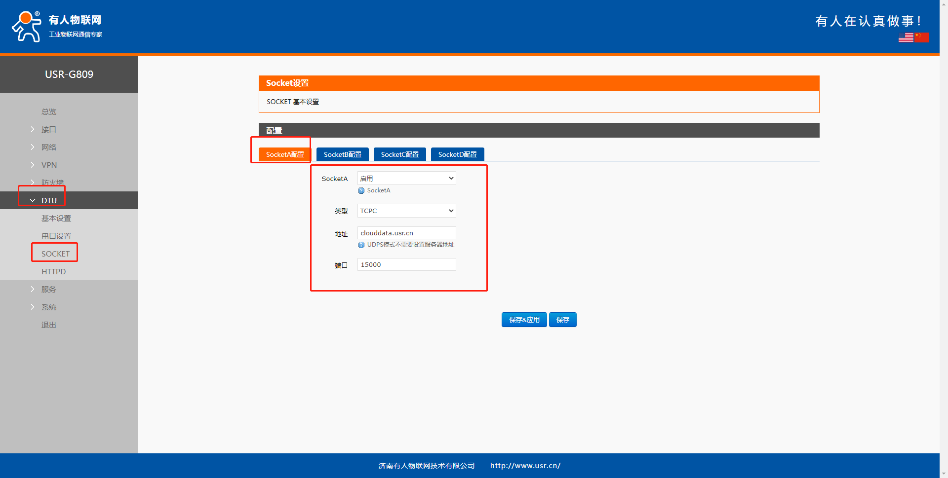 開啟SOCKET功能,設(shè)置服務(wù)器的IP地址(clouddata.usr.cn)以及端口號(15000),然后點擊應(yīng)用