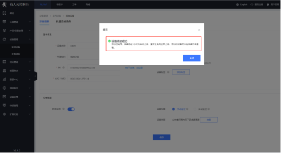 5、設(shè)備添加完成,設(shè)備將在1小時內(nèi)自動上線,重新上電則立即上線,添加的設(shè)備可以在設(shè)備列表查看,至此在有人云上添加設(shè)備完成