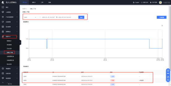 (4)在“數(shù)據(jù)中心”--“設(shè)備上下線”界面中可以查看相應(yīng)設(shè)備的上下線記錄,同時數(shù)據(jù)支持下載成EXCEL表格保存至本地