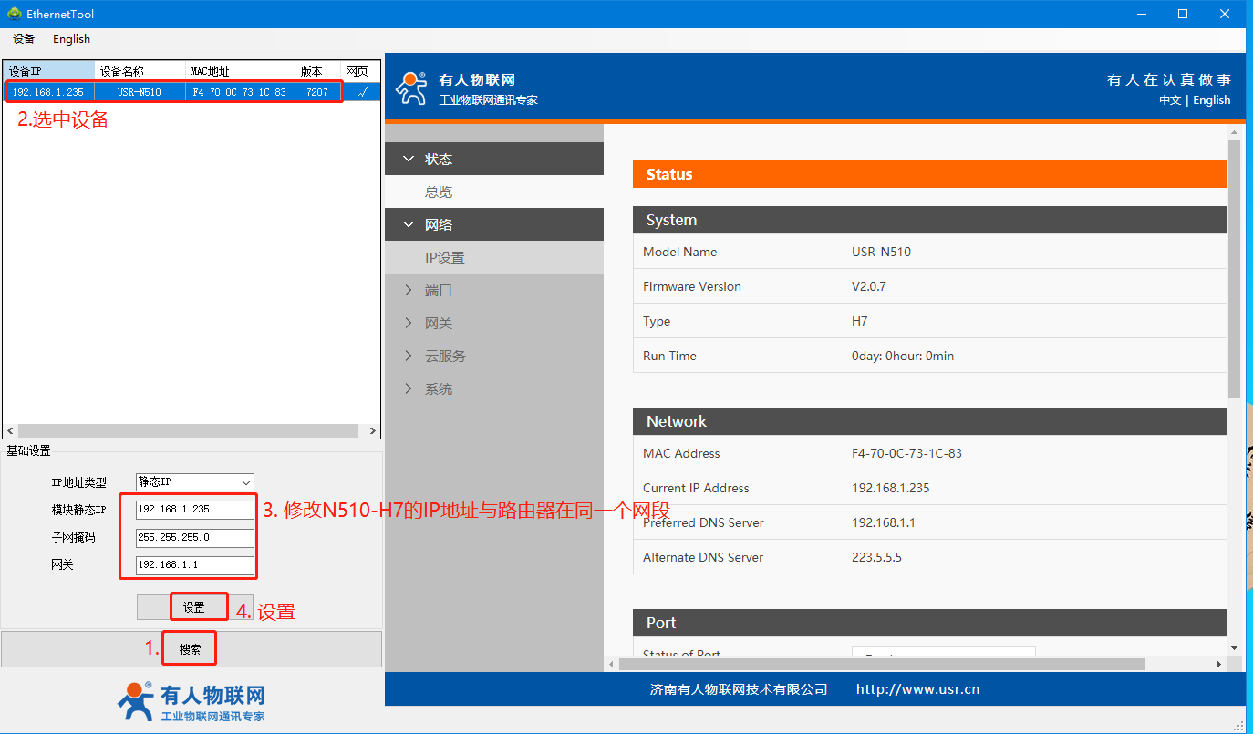 2>打開N510-H7設(shè)置軟件,搜索---選中設(shè)備---修改IP地址--設(shè)置參數(shù)