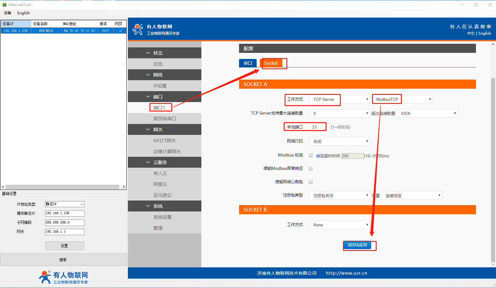 5>設(shè)置socket(網(wǎng)絡(luò))參數(shù):在本案例中用的是modbus網(wǎng)關(guān)功能,工作方式:TCP Server,啟用modbus TCP功能,其他參數(shù)保持默認(rèn)