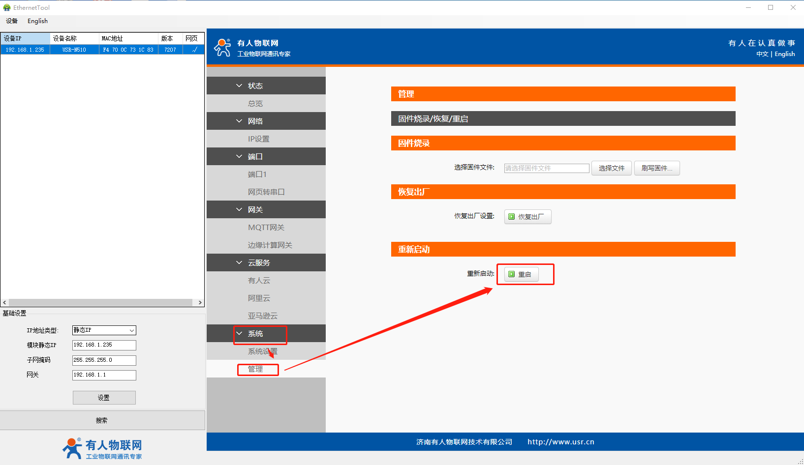 7>重啟N510-H7:系統(tǒng)---管理---重新啟動;等待模塊重新啟動后,可以重新打開設(shè)置界面看看,參數(shù)是否修改成功。