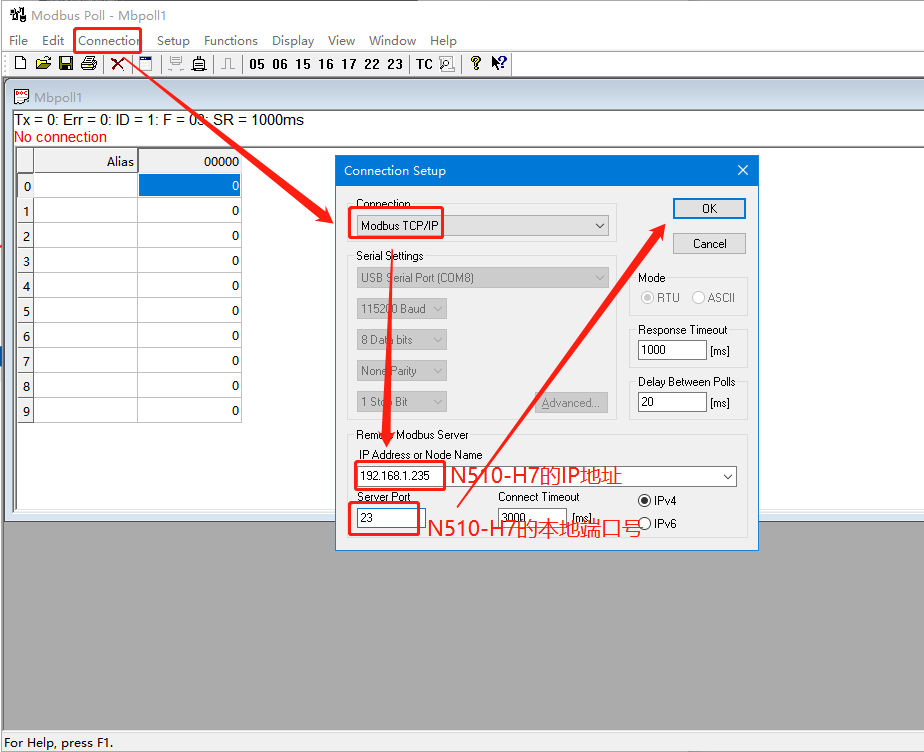1>硬件連接:N510-H7的串口通過USB轉(zhuǎn)232/485/422連接到電腦上,電腦和N510-H7接在同一個路由器上