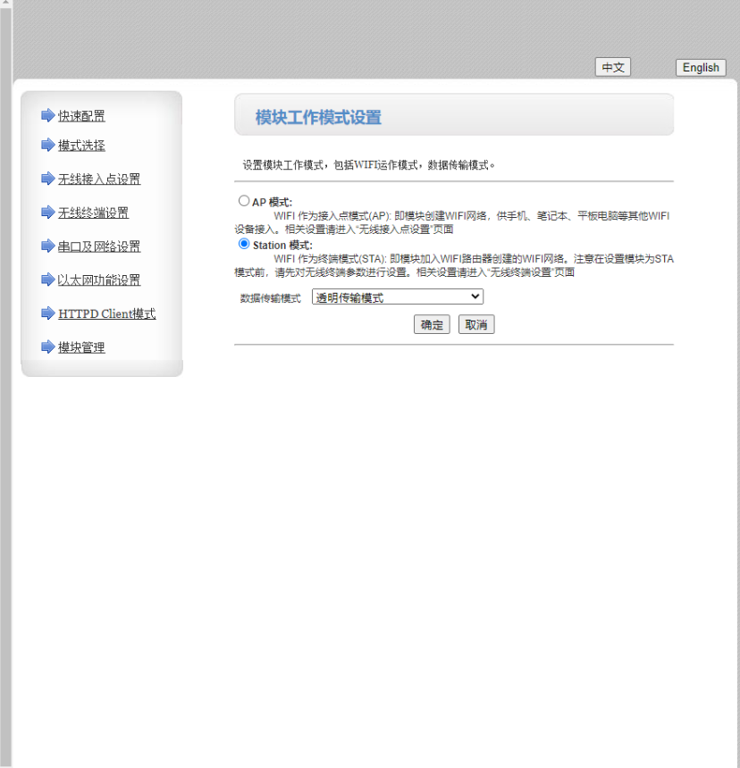1、登錄之后,在模式選擇中,將USR-W610的工作模式從默認(rèn)AP模式改為STA模式,點(diǎn)擊確定,會(huì)跳出重啟提示,建議不要立刻重啟,需要所有網(wǎng)頁參數(shù)設(shè)置完畢之后,最后再重啟USR-W610。