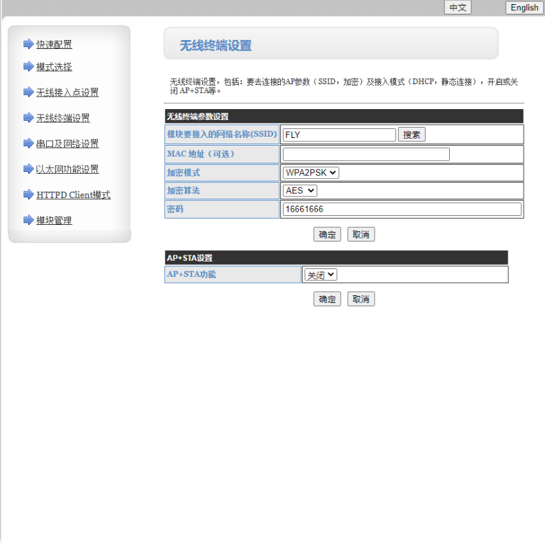 2、在無線終端設(shè)置中,模塊要接入的網(wǎng)絡(luò)名稱SSID,可以手動(dòng)輸入U(xiǎn)SR-W610設(shè)置STA模式要連接路由器wifi的名稱,選擇加密模式和加密算法,輸入路由器的wifi密碼。點(diǎn)擊確定。最后重啟USR-W610。