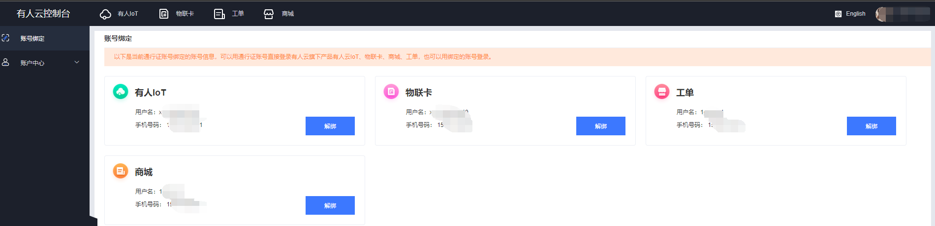 有人云賬號主要分為:有人iot賬號、物聯(lián)卡賬號、工單賬號、商城賬號與有人通行證賬號,如果需要更換使用者,為了賬號的安全,建議全部賬號的綁定信息均進行修改。