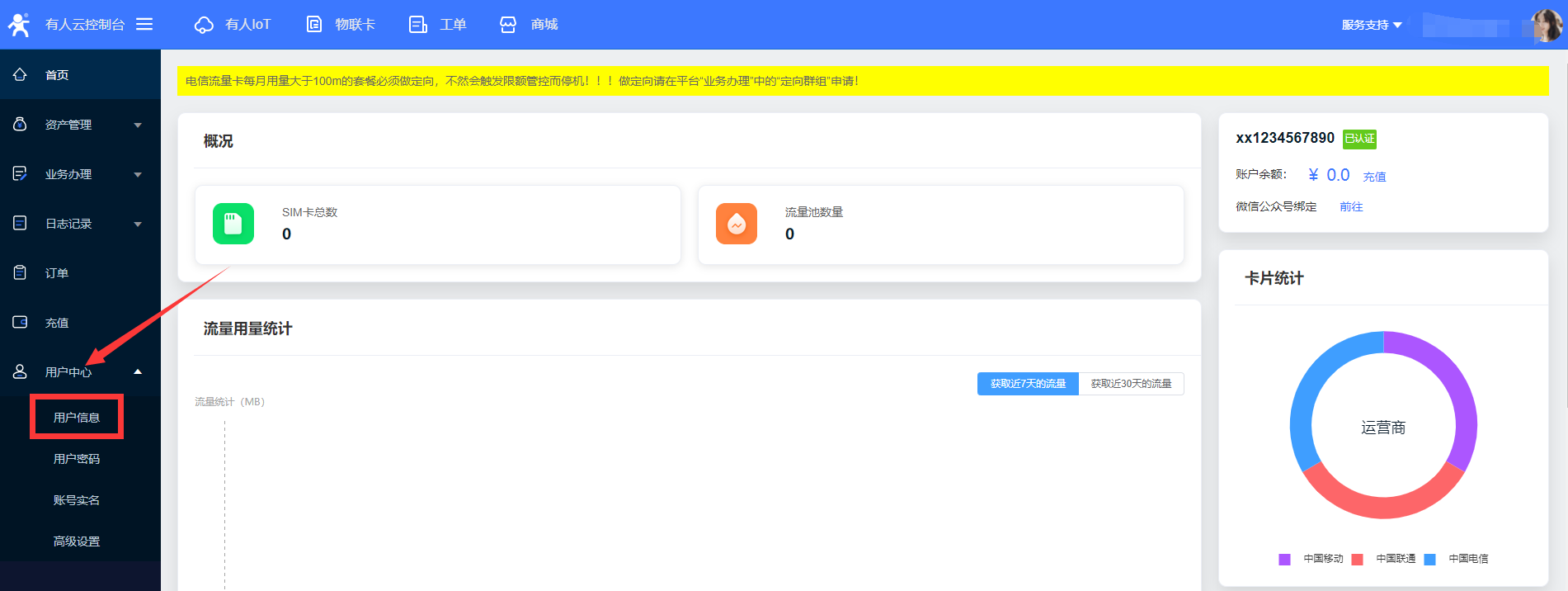 1、進入物聯(lián)卡平臺,在左側(cè) 用戶中心 菜單中進入用戶信息界面