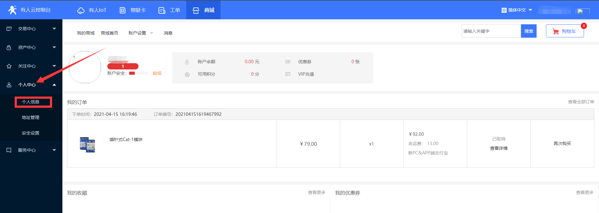 1、進入商城平臺,在左側(cè) 個人中心 菜單中進入 個人信息 界面