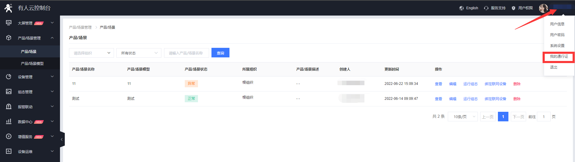 1、在有人iot界面點擊右上角用戶名,進入用戶信息界面