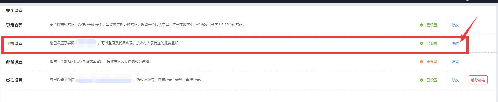 3、在安全設置界面找到 手機設置 一欄,點擊后面修改