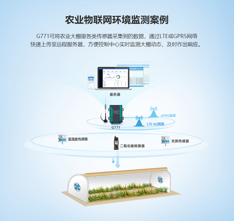 G771可將農(nóng)業(yè)大棚里各類(lèi)傳感器采集到的數(shù)據(jù),通過(guò)LTE或GPRS網(wǎng)絡(luò)快速上傳至遠(yuǎn)程服務(wù)器,方便控制中心實(shí)時(shí)監(jiān)測(cè)大棚動(dòng)態(tài),及時(shí)作出相應(yīng)
