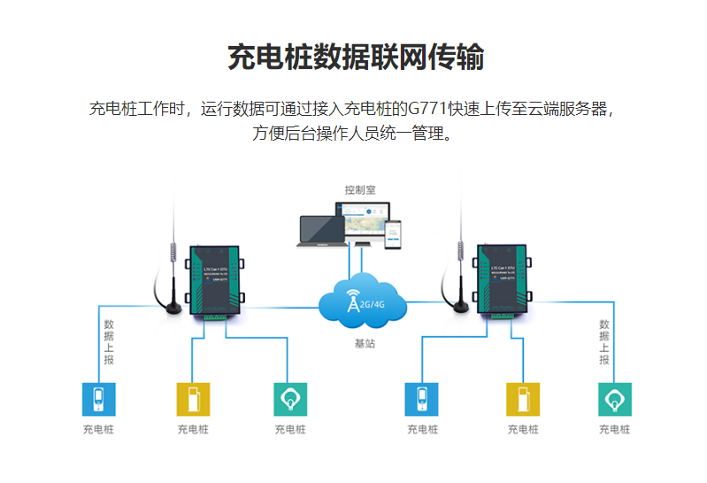 充電樁工作時(shí),運(yùn)行數(shù)據(jù)可通過(guò)接入充電樁的G771快速上傳至云端服務(wù)器,方便后臺(tái)操作人員統(tǒng)一管理