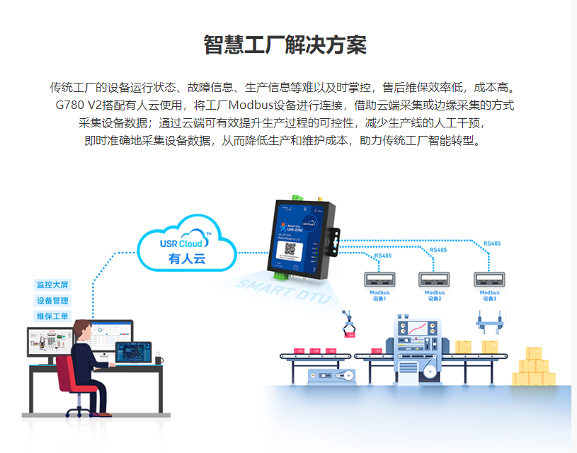G780 V2搭配有人云使用,將工廠(chǎng)Modbus設(shè)備進(jìn)行連接,借助云端采集或邊緣采集的方式采集設(shè)備數(shù)據(jù);通過(guò)云端可有效提升生產(chǎn)過(guò)程的可控性,減少生產(chǎn)線(xiàn)的人工干預(yù),即時(shí)準(zhǔn)確的采集設(shè)備數(shù)據(jù),從而降低生產(chǎn)和維護(hù)成本,助力傳統(tǒng)工廠(chǎng)智能轉(zhuǎn)型