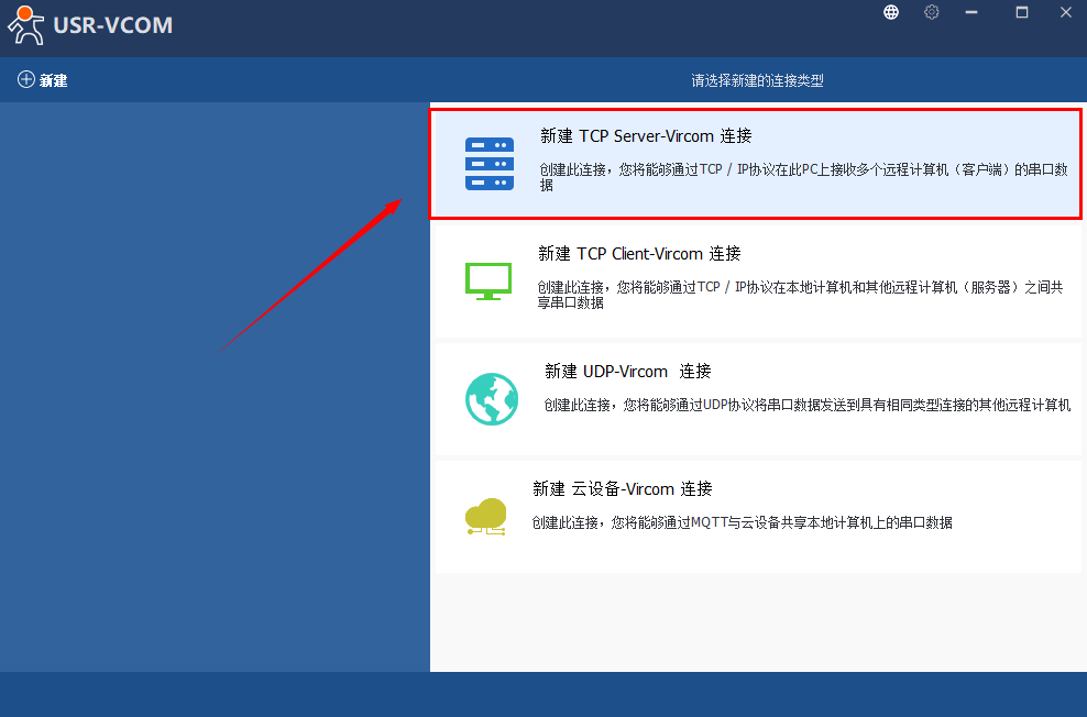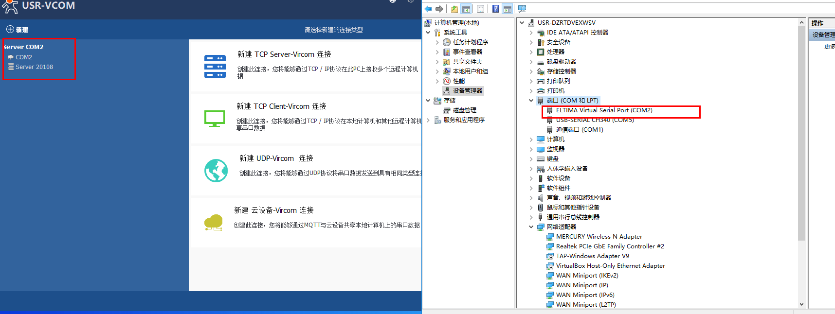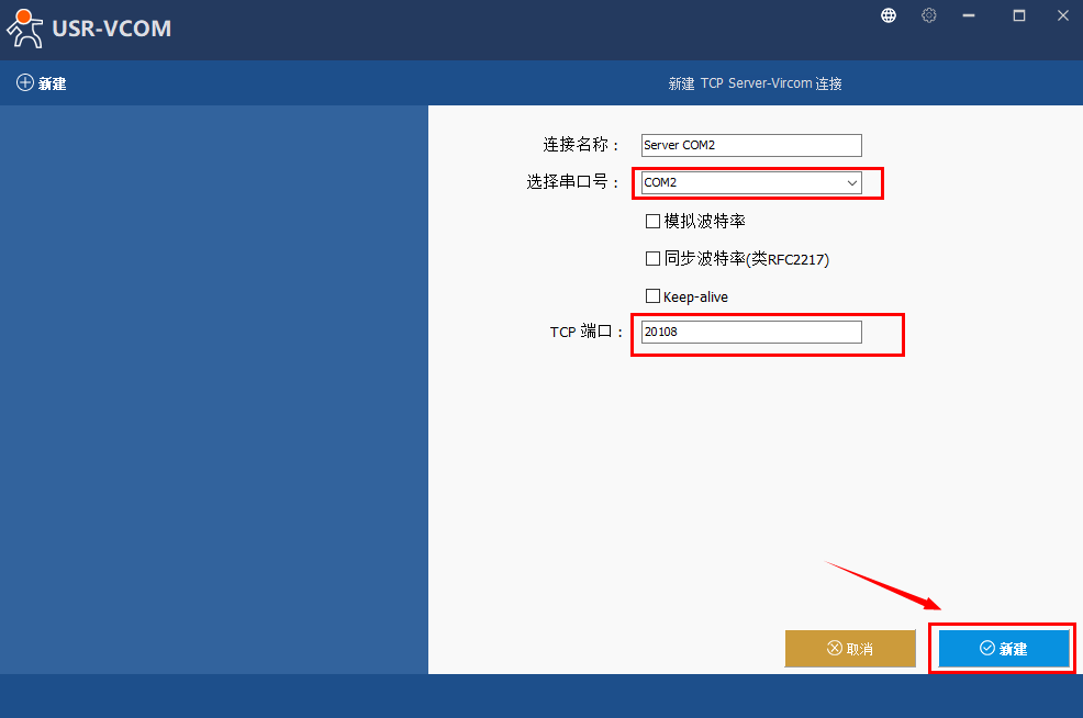 點擊“新建 TCP Server-Vircom連接”,選擇一個電腦設(shè)備管理器中不存在的一個串口號, 自定義一個TCP端口:20108,點擊新建后,電腦上會出現(xiàn)虛擬的COM口號。