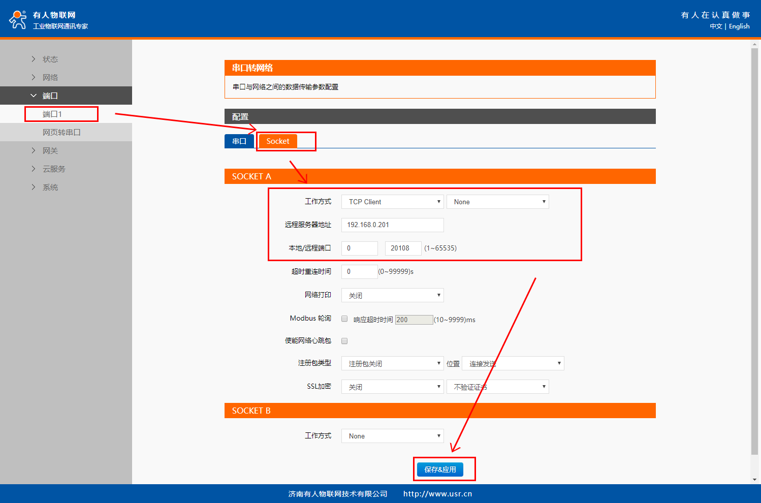 在“端口”>“端口1”界面中的“Socet”配置Socket A的工作模式為“TCP Client”