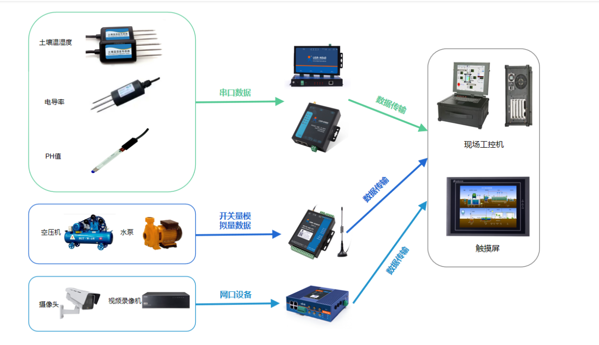 v 若現(xiàn)場(chǎng)終端設(shè)備為開(kāi)關(guān)量或模擬量設(shè)備,可以通過(guò)網(wǎng)絡(luò)IO設(shè)備將數(shù)據(jù)傳輸至現(xiàn)場(chǎng)本地工控機(jī)或觸摸屏顯示。若現(xiàn)場(chǎng)方便布線或有wifi覆蓋可選用網(wǎng)絡(luò)IO中EWR版本;