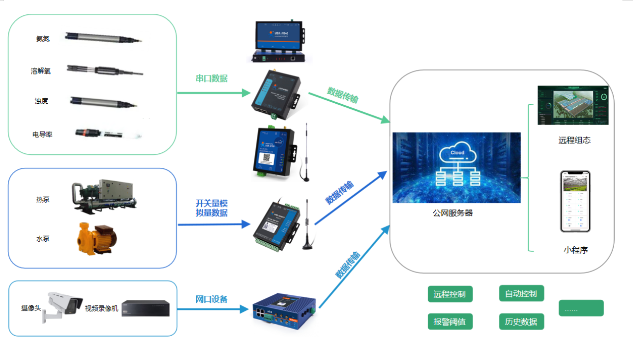 v 若現(xiàn)場終端設(shè)備為串口設(shè)備,可以通過串口服務(wù)器、wifi串口服務(wù)器或DTU將數(shù)據(jù)傳輸至遠(yuǎn)程服務(wù)器顯示。若現(xiàn)場有4G信號時(shí)可選用DTU進(jìn)行數(shù)據(jù)傳輸;若方便布線可選用串口服務(wù)器;若現(xiàn)場有wifi覆蓋可選用wifi串口服務(wù)器;