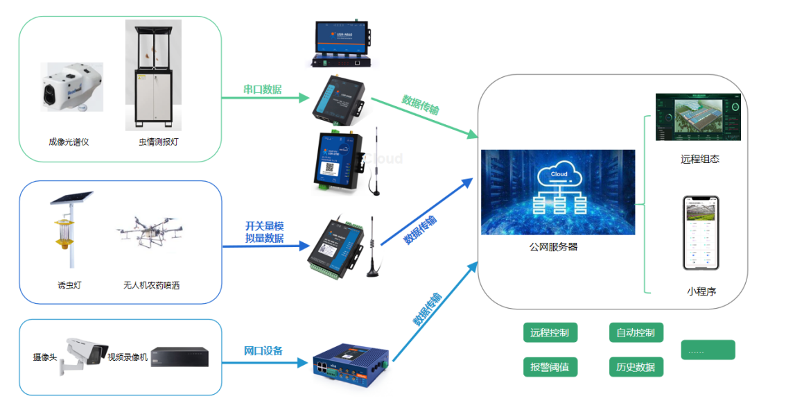 開關量接口,如誘蟲燈開關、加熱管開關、無人機農藥噴灑開關等;