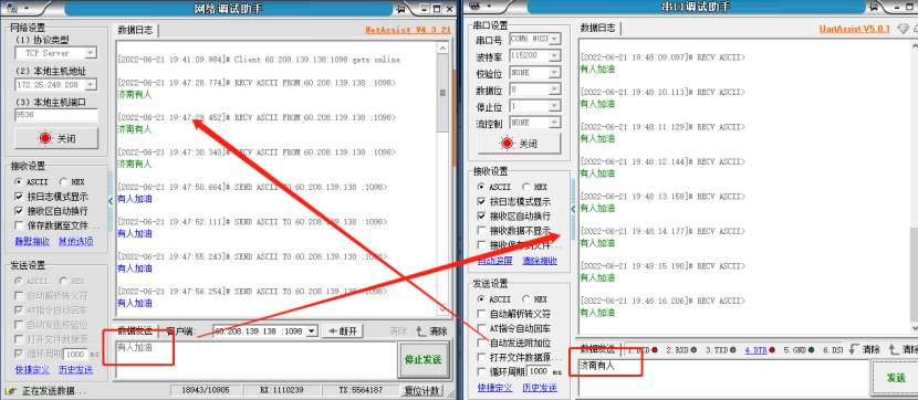 2、重啟后進(jìn)行通信測(cè)試,測(cè)試結(jié)果如下圖所示??梢钥吹綌?shù)據(jù)收發(fā)都是正常的。