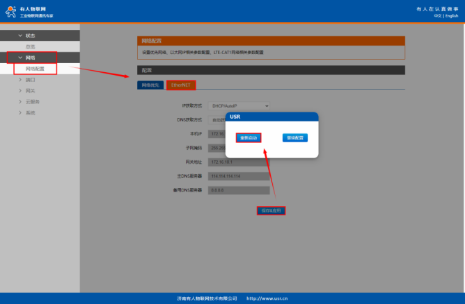 8、若需要修改M100 IP, 使用工具重新搜索設(shè)備,點擊進入配置界面,在 網(wǎng)絡(luò) - 網(wǎng)絡(luò)配置 - EtherNET 界面中自行修改設(shè)備網(wǎng)口ip獲取方式,然后M100通過網(wǎng)口接入路由器上網(wǎng)。