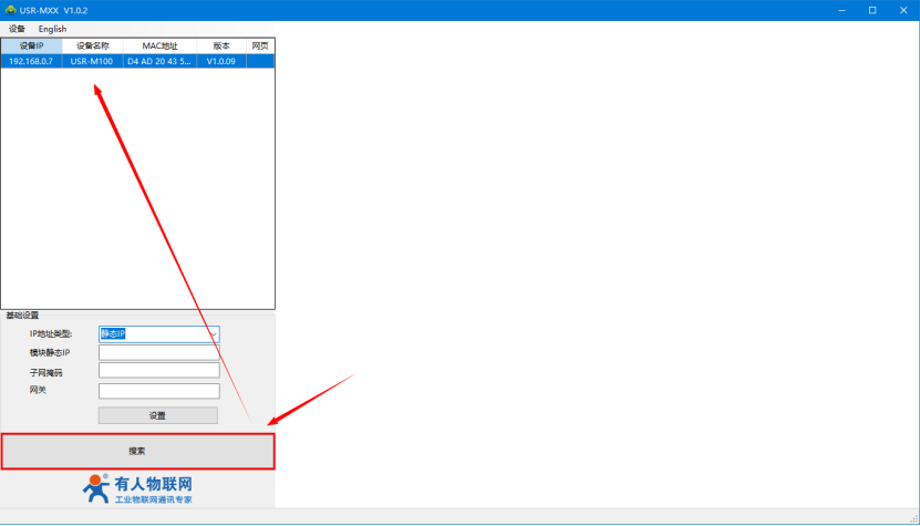 用配置軟件搜索M100設(shè)備,單擊搜索,搜搜到設(shè)備后雙擊設(shè)備。