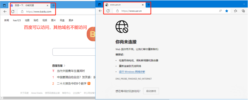 <2>連接路由器的設(shè)備將除設(shè)置的域名可以訪問(wèn)外,其余域名都無(wú)法訪問(wèn)設(shè)置。注:若選擇白名單,而未添加規(guī)則,默認(rèn)白名單為空,即所有域名都不能夠訪問(wèn)