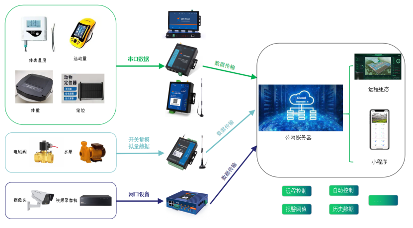 v 若現(xiàn)場終端設(shè)備為串口設(shè)備,可以通過串口服務(wù)器、wifi串口服務(wù)器或DTU將數(shù)據(jù)傳輸至遠(yuǎn)程服務(wù)器顯示。若現(xiàn)場有4G信號時可選用DTU進(jìn)行數(shù)據(jù)傳輸;若方便布線可選用串口服務(wù)器;若現(xiàn)場有wifi覆蓋可選用wifi串口服務(wù)器;