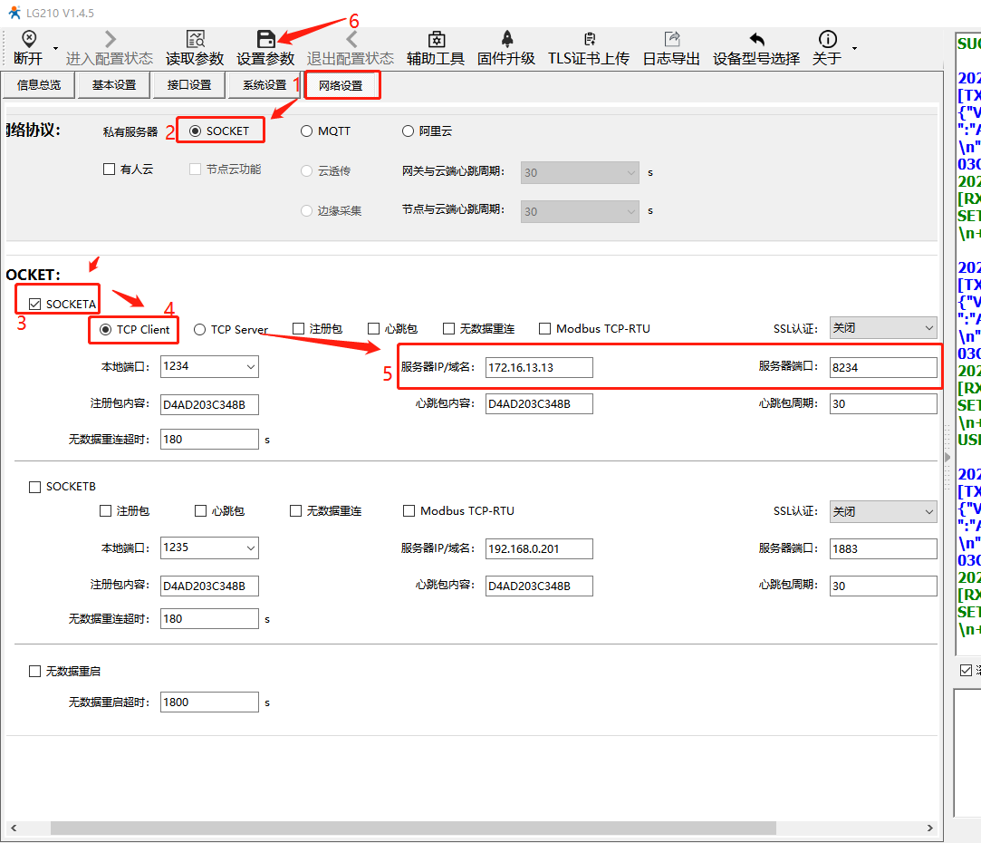 服務(wù)器IP/配置為服務(wù)器電腦的IP,服務(wù)器端口配置為服務(wù)器的端口號(hào)8234,點(diǎn)擊“設(shè)置參數(shù)”,點(diǎn)擊重啟設(shè)備,待設(shè)備重啟,服務(wù)器可以監(jiān)聽到該LG210連接。